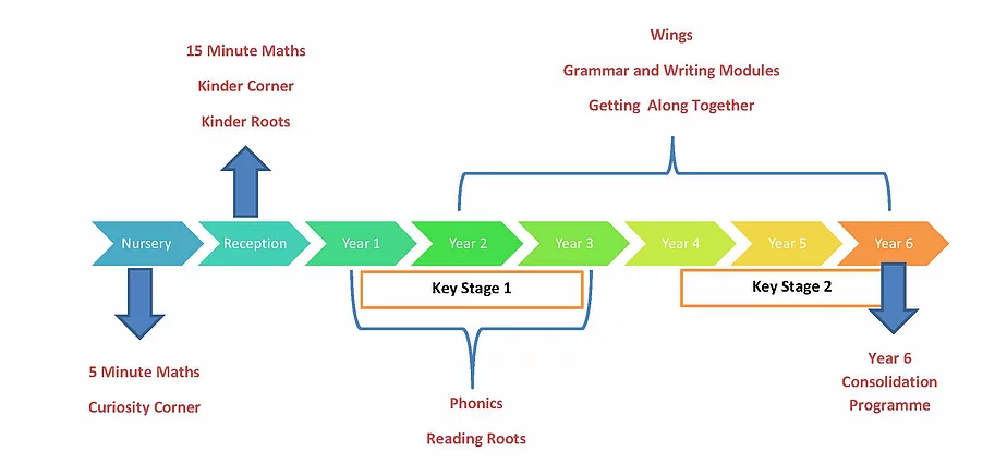 The five levels of materials include detailed daily lesson plans for teachers including assessments, pupil materials that support them, resources for photocopying as well as manuals for extended writing and grammar-for-editing.